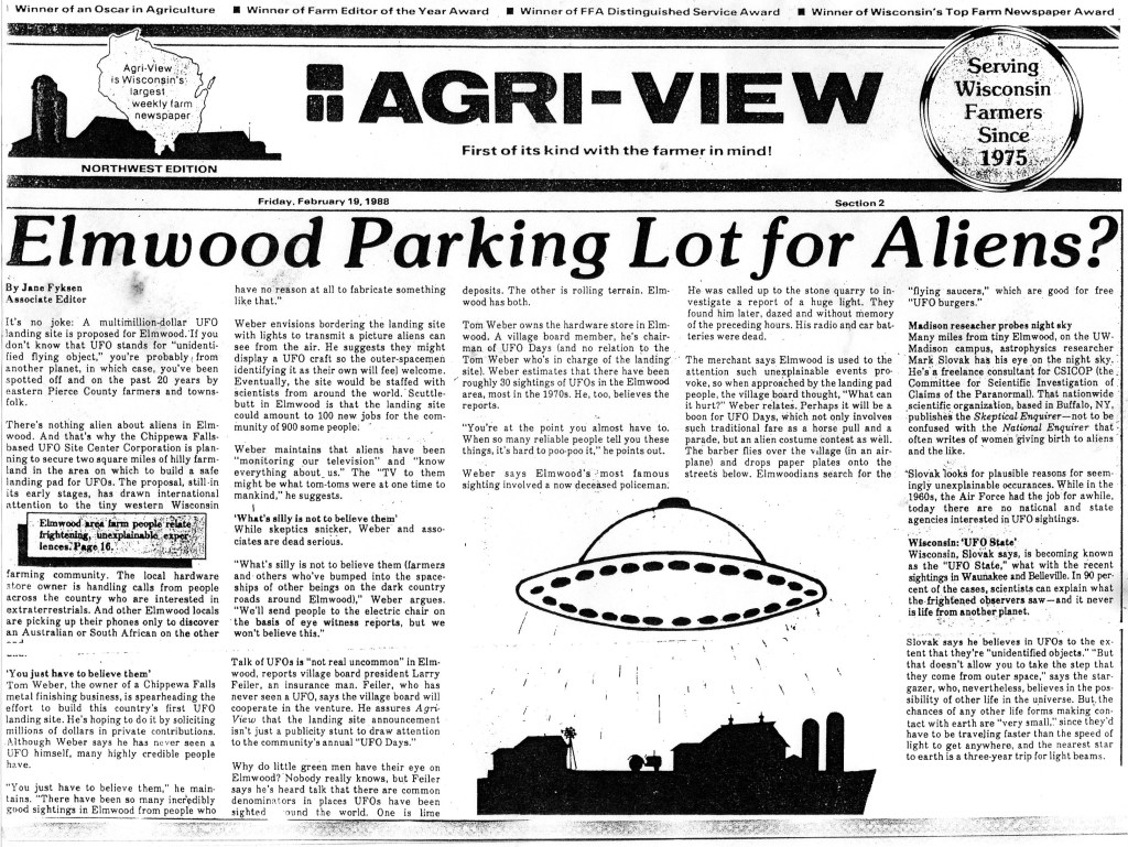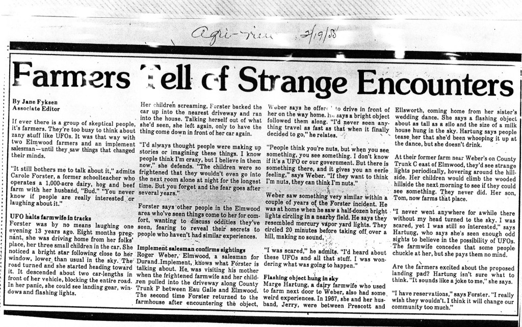 Source: Jane Fyksen, “Farmers Tell of Strange Encounters,” and “Elmwood Parking Lot for Aliens,” Agri-View (2/19/1988).