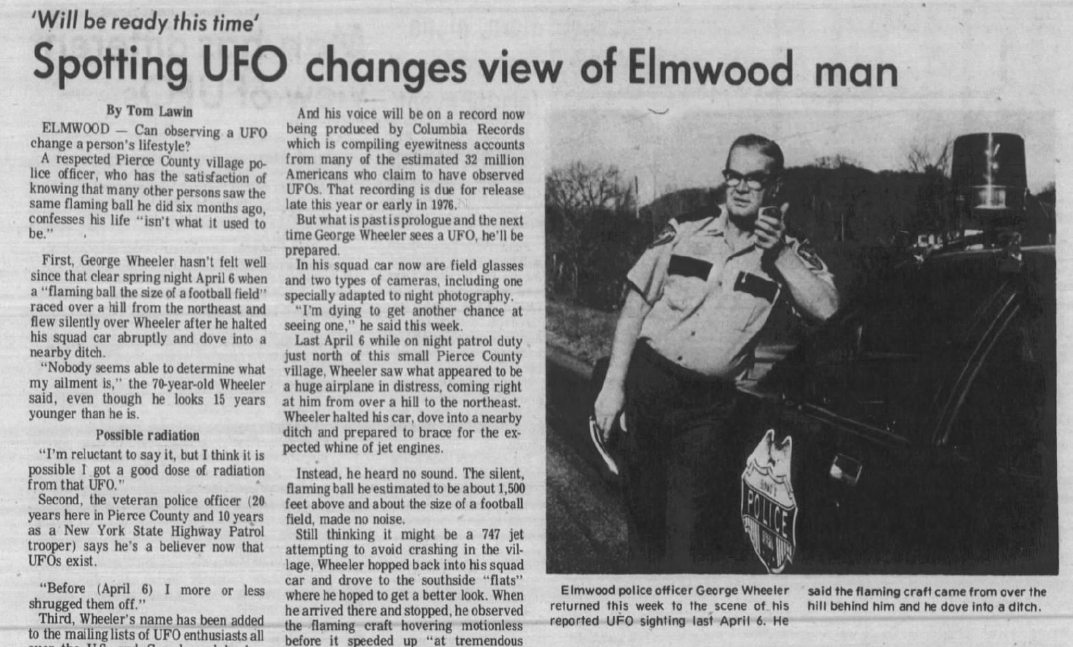 After police officer George Wheeler first encounter with a UFO at Elmwood in April 1975, he was eager to see another. An article in the Eau Claire Leader-Telegram recounts the story of his encounter and speculates optimistically about the possibility of a future UFO encounter for the officer. The article proved to be eerily prophetic. Twelve months later, Wheeler encountered the phenomenon outside Elmwood again, but in that second encounter, things did not go as well as he had hoped. Here’s the story of his first encounter in April, 1975. This article is one in a series of 1975 UFO incidents in Minnesota, Western Wisconsin, and Iowa.