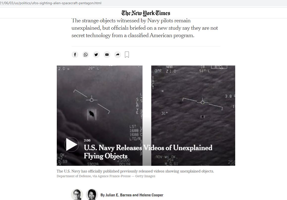 That’s the disappointing headline for the online version of the new article in the New York Times which purports to spill the beans on the new government report on UFOs, but don’t let it fool you. It’s a deceptive headline. The print version of the June 4 New York Times has a much more accurate and sober-minded headline across the top of the story: “U.S. Concedes It Can’t Identify Flying Objects.” Let’s go with that headline: