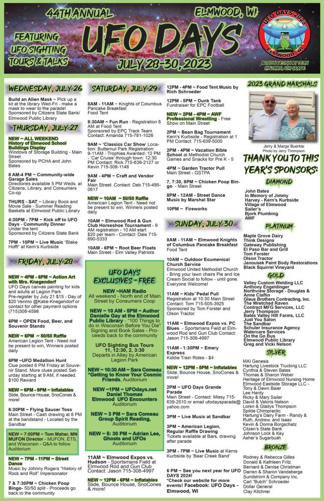 That’s followed by the big UFO event of the year. This weekend it’s UFO Days in Elmwood, Wisconsin, and yours truly will be present to talk about the history of UFOs in Elmwood. There’s actually a ton of a great stuff on schedule. Download the full schedule below.